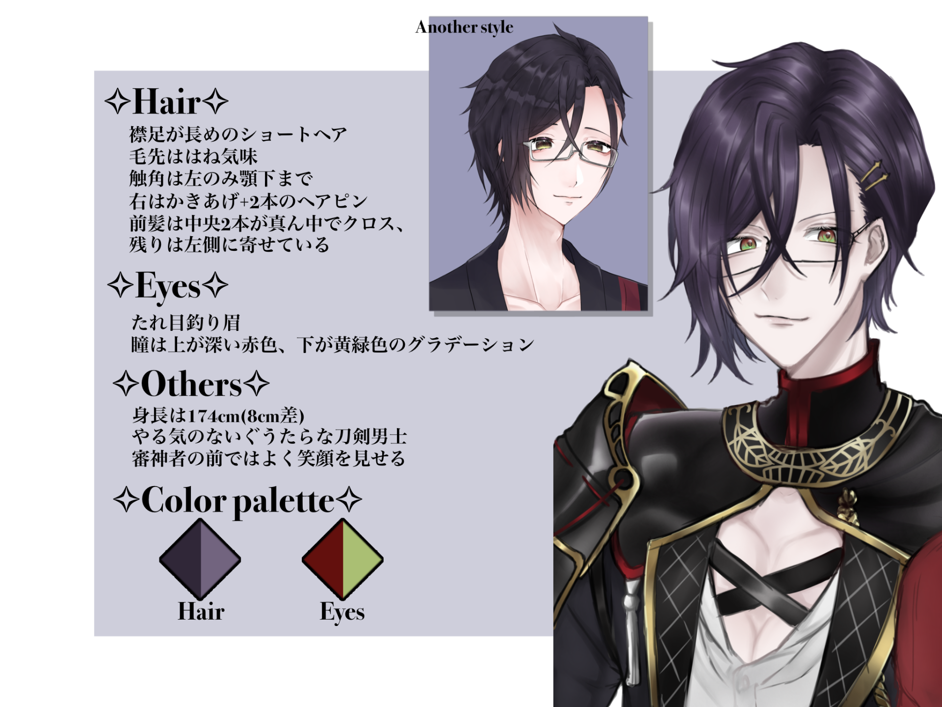 ・やる気がないのが売りの刀剣男士。面倒くさがりで働くのが嫌いだが任された仕事はきっちりやる。いかに自分が効率よく最短時間で動けるのかを計算して日々を過ごしている。地頭と要領がいい